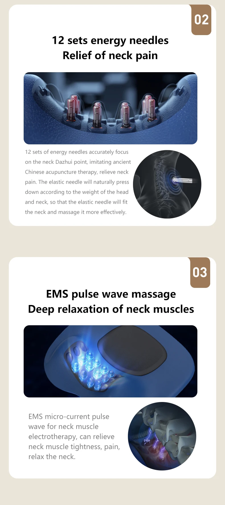 EMS Pulse Technology: Stimulates muscles to relieve pain and improve circulation.
